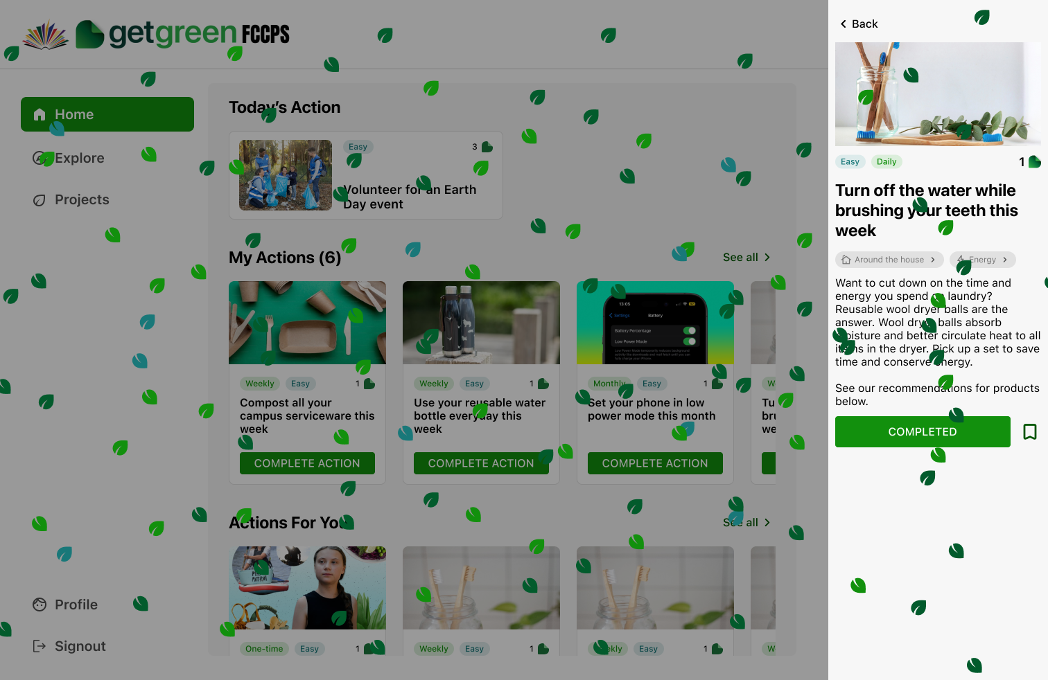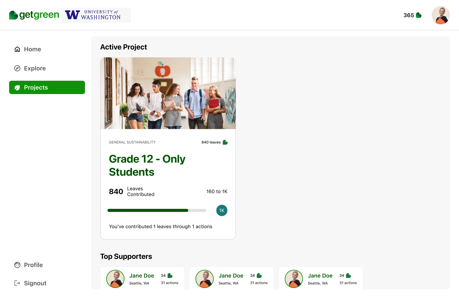 Projects represent groups within an organization that users can choose to join based on their interests. The leaves earned through individual actions contribute to the group’s overall goal. Users can browse available projects, join the ones they resonate with, and view leaderboards for each project.